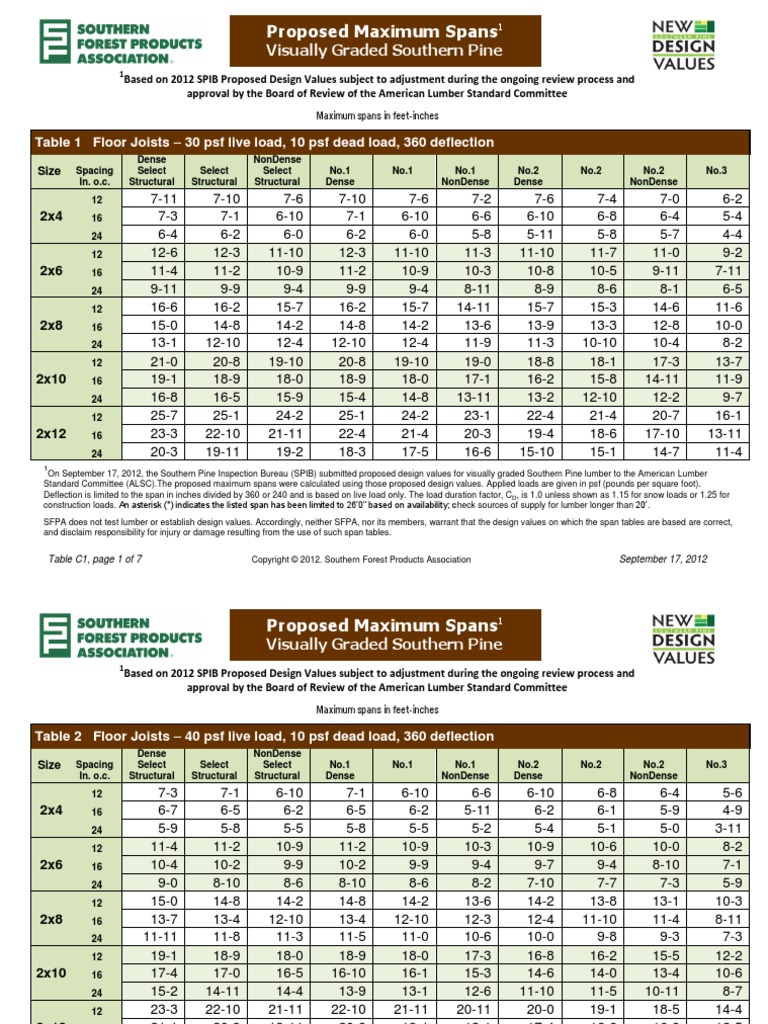 12 16 24 12 16 24 12 16 24 12 16 24 Simplified maximum span tables for selected visual and mechanical grades of southern pine lumber in sizes 2×4 thru 2×12. Spans for ceiling joists shall be in accordance with tables r802.4 (1) and r802.4 (2). Span tables for joists and rafters 3 american wood council table 9.1 required compression perpendicular to grain design values (f c⊥) in pounds per square inch for simple span joists and rafters with uniform load. B) if the spans are not equal, the largest span is not greater that twice the smallest adjacent span.